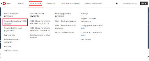「Pay & transfer」にカーソルを合わせ「Transfer to your local HSBC accounts」をクリック