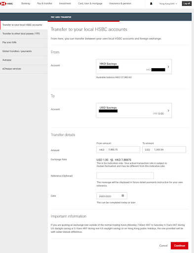 HSBC香港口座の資金を両替するには、次の2つの方法があります。