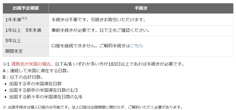 “海外赴任等の理由により、法令の定める「非居住者」に該当する場合、証券総合取引口座を「解約」していただくか、当社が認める範囲で「休眠口座」として口座を継続することができます。”
