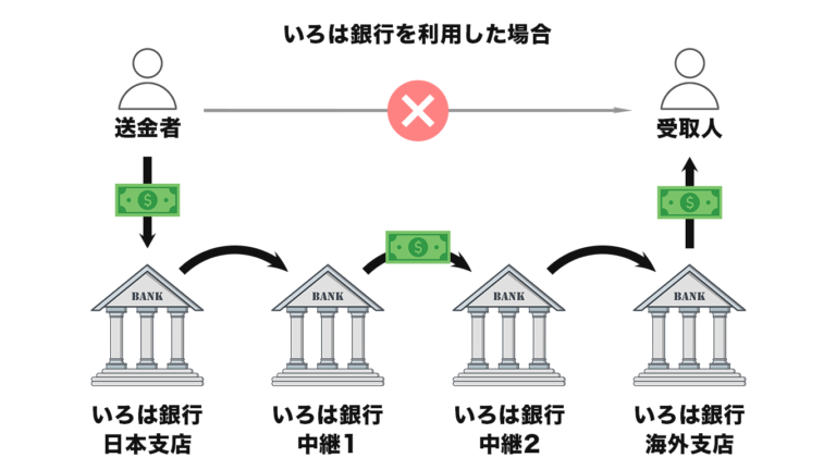 ※架空の『いろは銀行』を利用して海外送金する場合は以下のようにお金が送られます。